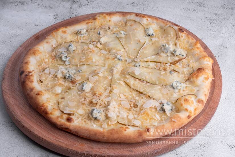 Соус вершковий, моцарела, груша, дор блю, мигдалеві пластівці, пармезан.