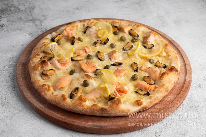 Соус вершковий, моцарела, креветки, мідії, лосось, каперси, лимон.