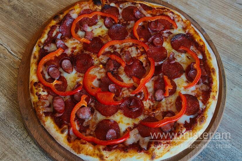 Гострий соус пелаті, моцарела, гостра пепероні, мисливські ковбаски та перець болгарський.