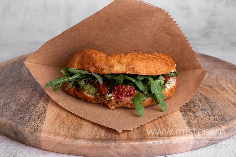 Булка бейгл, вершковий сир, авокадо, в`ялені томати, рукола, соус унагі.