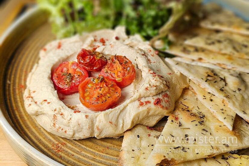 Поживна закуска на основі відварного нуту та кунжутної пасти, подається з салатом, в’яленими томатами та фокачо.