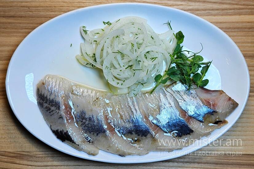 Шматочки оселедцю, засоленого за власною рецептурою. Подається з маринованою цибулею та зеленню в духмяній олії.