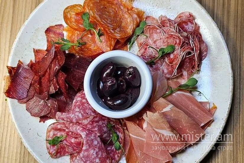 Розкішне поєднання різних видів м`яса, створене для справжніх гурманів - прошуто крудо, салямі мілано, салямі наполі, фует, бастурма і оливки каламата.