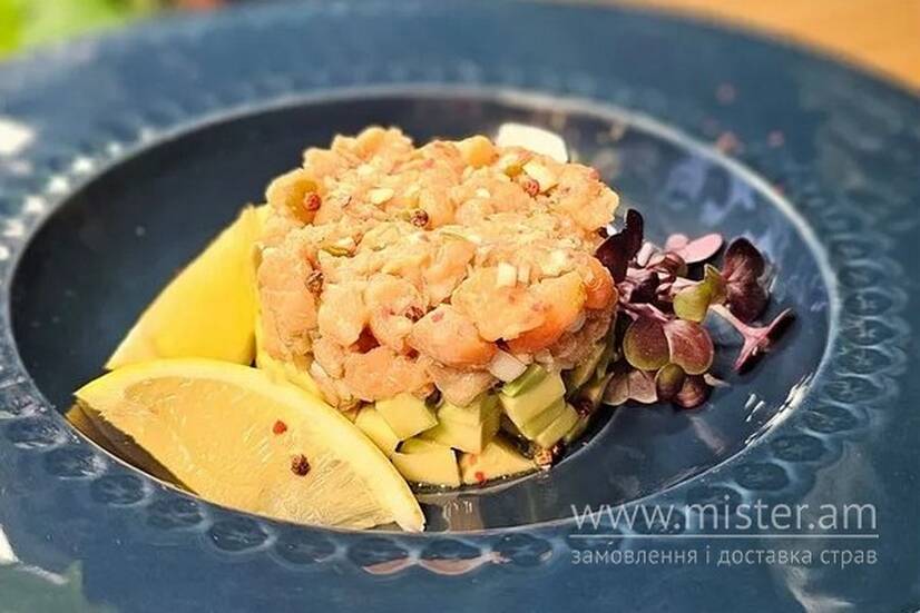Закуска зі свіжого філе червоної риби маринованої у соєвому соусі, з додаванням цибулі-шалот та каперсів. Подається на подушці з авокадо. Баланс смаків створює ідеальний баланс.