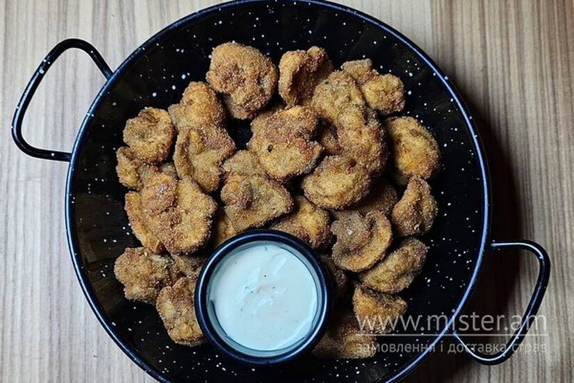 Печериці обсмажені до золотистої скоринки в сухарях. Подаються з часниковим соусом.