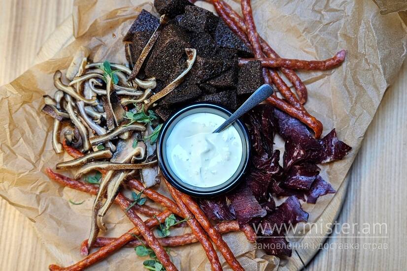 Апетитна добірка, що поєднується з будь-яким сортом пива: ковбаски Кабаносі 2х видів, бастурма, гріночки з бородинського хліба і часниковий соус.
