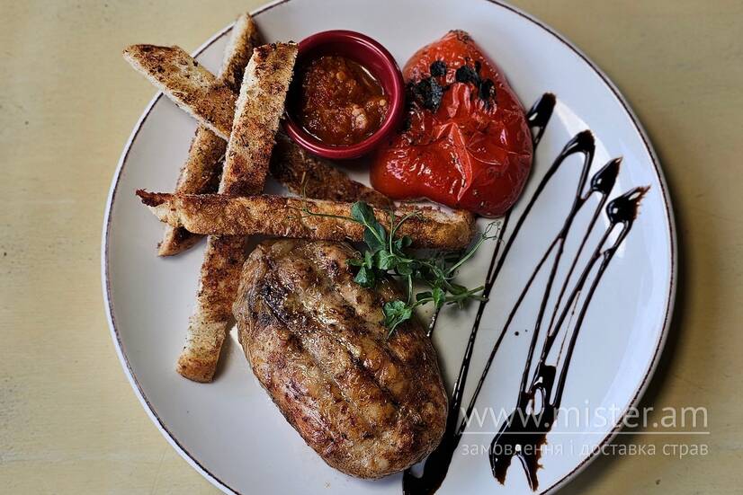 Смажене куряче стегно в хрусткій скоринці з димною моцарелою. Подається з перцем підсмаженим на вогні.