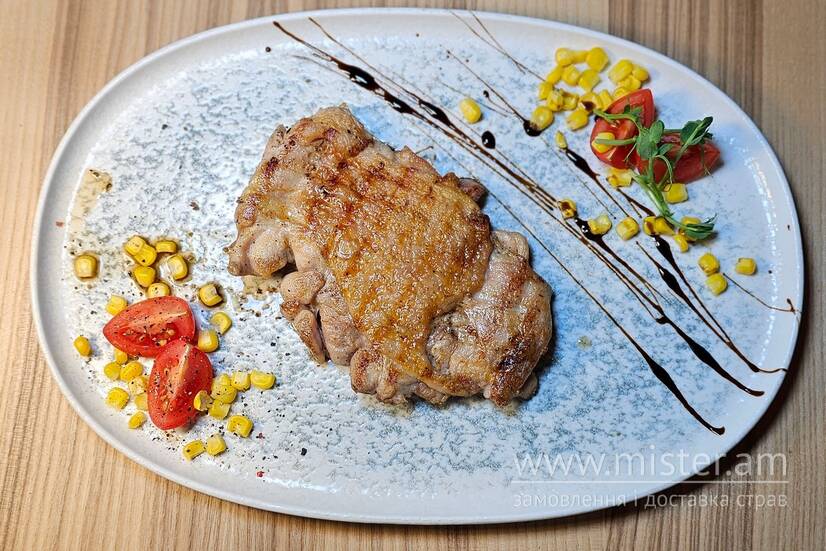 Соковитийк курячий стейк, обсмажений на сковорідці гриль.