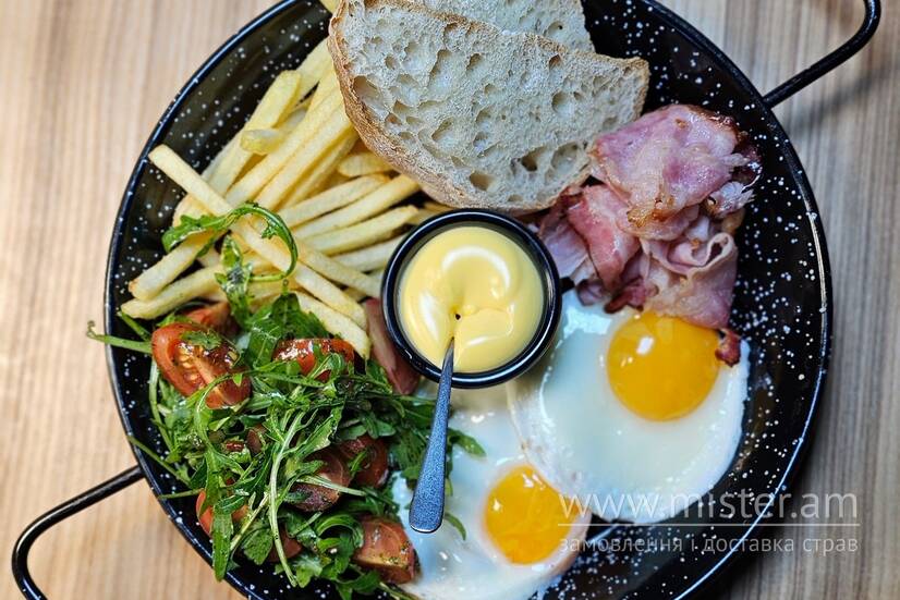 Англійський сніданок – це потужна бомба, яка зарядить вас на цілий день! Смажена яєчня з хрустким беконом, салатом із томатів і руколи. Подається з картоплею фрі з сирним соусом.