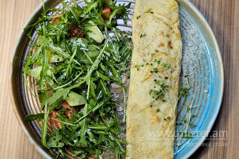 Французький омлет готується зі збитих яєць з невеликим додаванням сирів Гауда та Пармезан. Подається з салатом зі свіжого огірка, руколи та томатами чері.