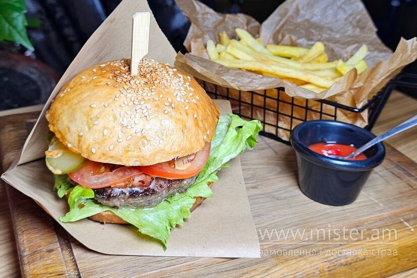 Ситний бургер з запашною булочкою власного виробництва, з соковитою котлетою з яловичини, сиром чеддер, овочами та зеленню. Подається з картоплею фрі та червоним соусом.