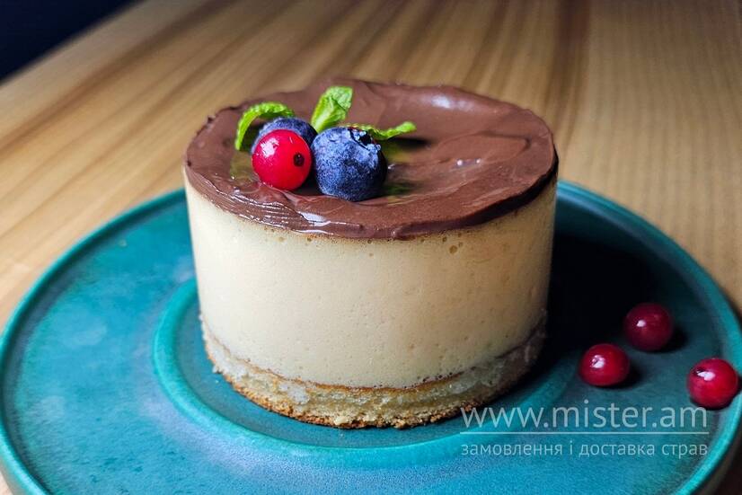 Баскський фісташковий чізкейк з полуницею та шоколадом