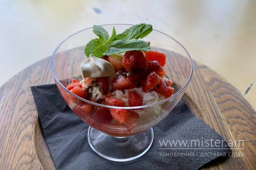 Вишукана вершково-кремова панна кота, в поєднанні з хрумкими шматочками меренги та свіжою полуницею.