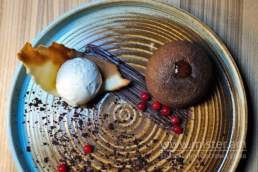 Популярний десерт французького походження, теплий шоколадний кекс з рідкою шоколадною начинкою, подається з кулькою ванильного морозива.