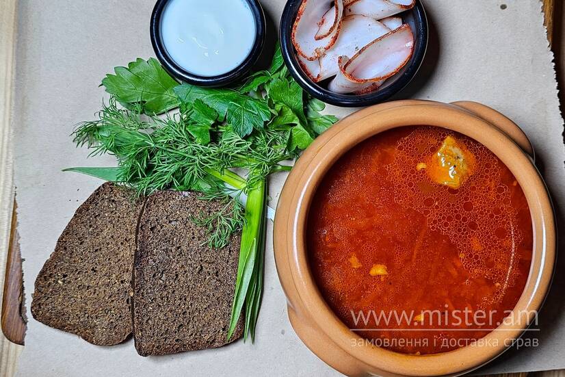 Український м`ясний борщ. Подається з слайсами пікантного сала, сметаною, зеленню та крафтовим житнім хлібом.