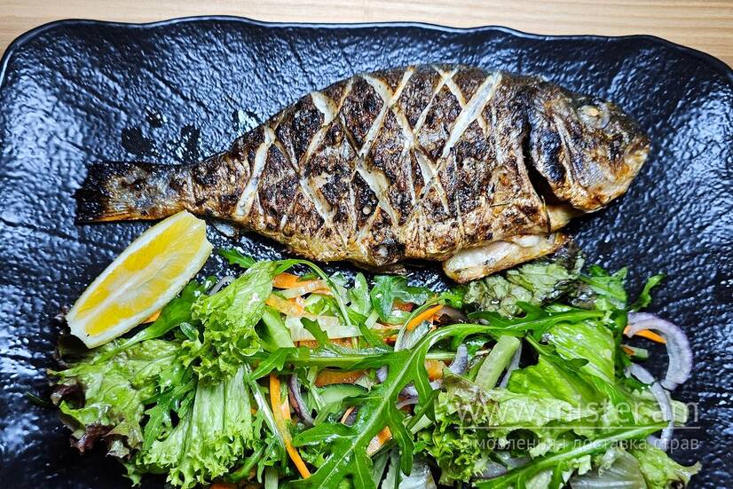 Морська рибка дорадо маринована в пряних травах, смажиться на мангалі. Подається з салату із свіжих овочів.