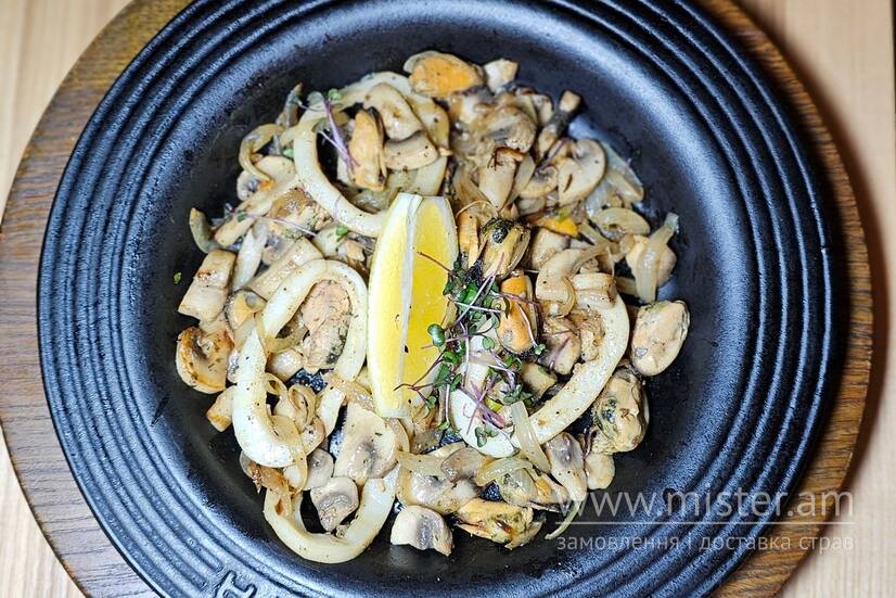 Обсмажені мідії та кальмари з овочами, печерицями та цибулею - поєднує в собі неповторний аромат та ніжність, що ідеально підійдуть для легкої вечері.
