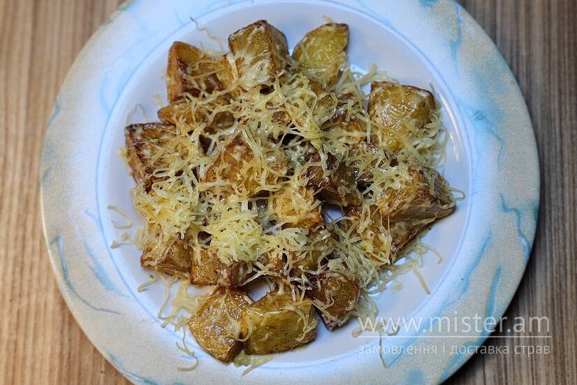 Фірмова обсмажена картопля шматочками, полита майонезом, посипана тертим сиром. Часник за бажанням.
