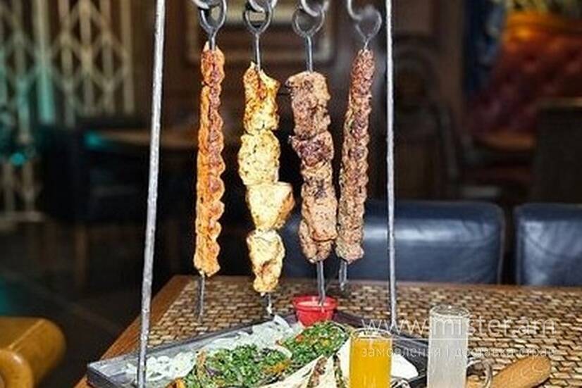 Фірмова страва на компанію: шашлик з свинного ошийка, шашлик з індички, люля з курятини, люля з телятини, подається з лавашем та салатом.