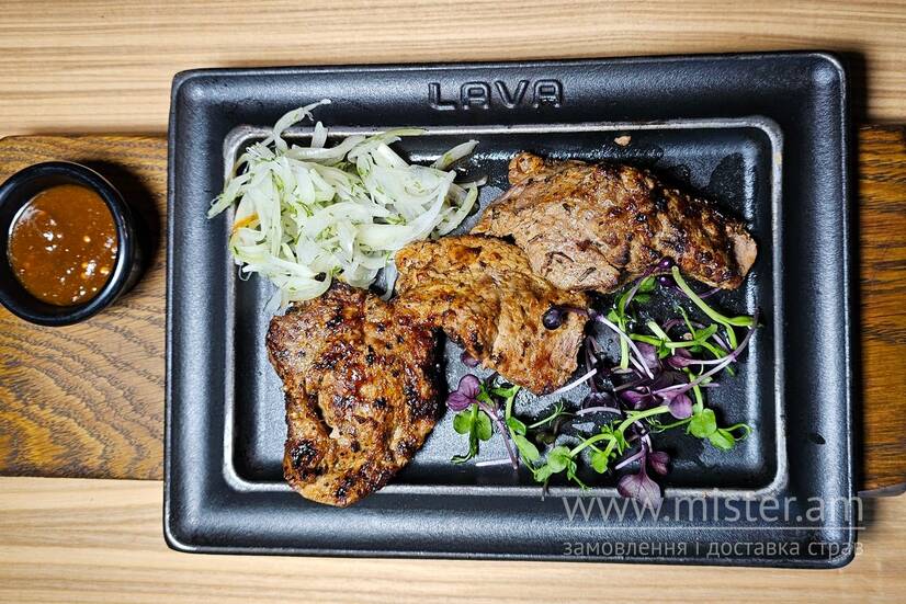 Шашлик з соковитого телячого філе, обсмаженого на мангалі, подається з соусом барбекю та маринованою цибулею.