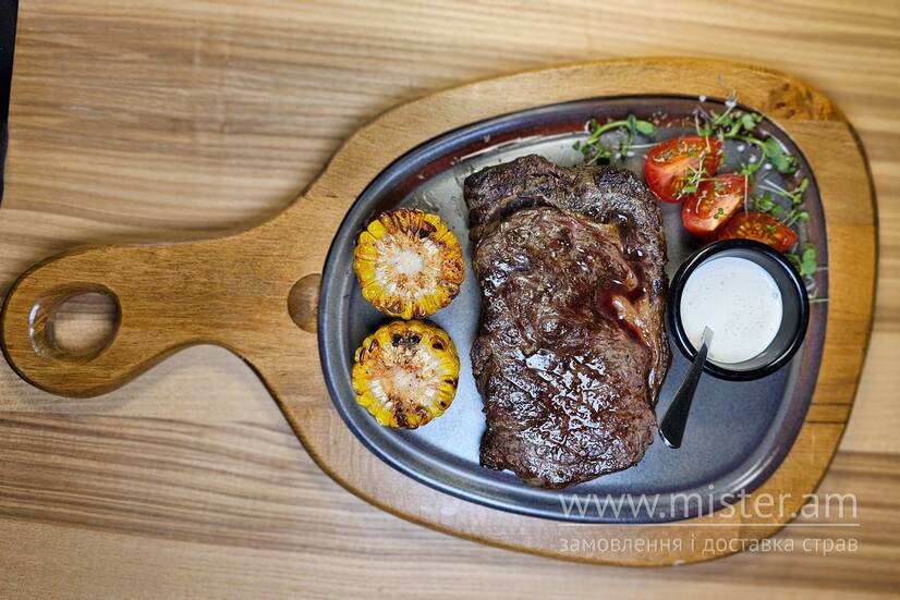 Соковитий стейк рібай подається з соусом Пепе Верде та шайбами кукурудзи обсмажених на мангалі.