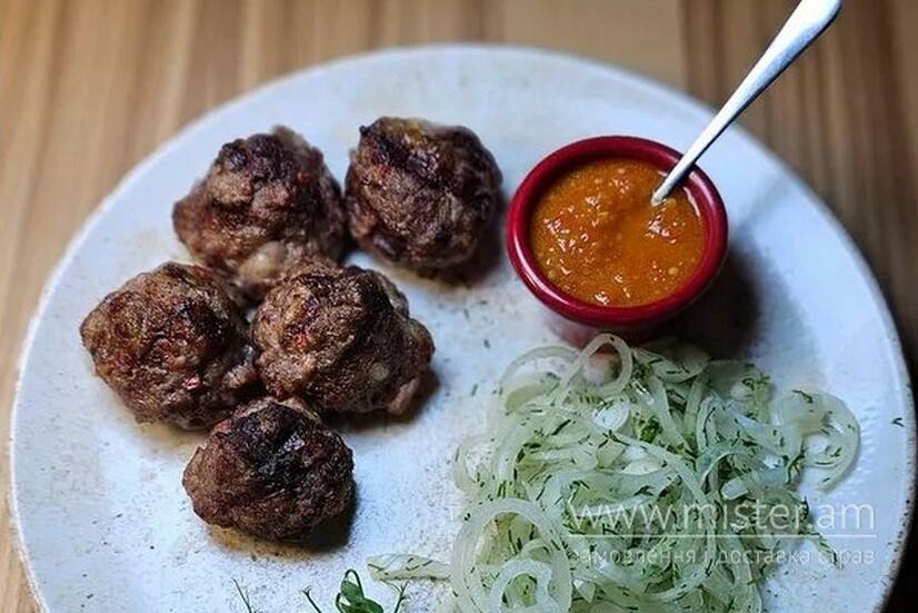 Пікантні шматочки рубленого м'яса з сиром, копченим беконом та перцем чилі. Подається з соусом Айвар та маринованою цибулею.