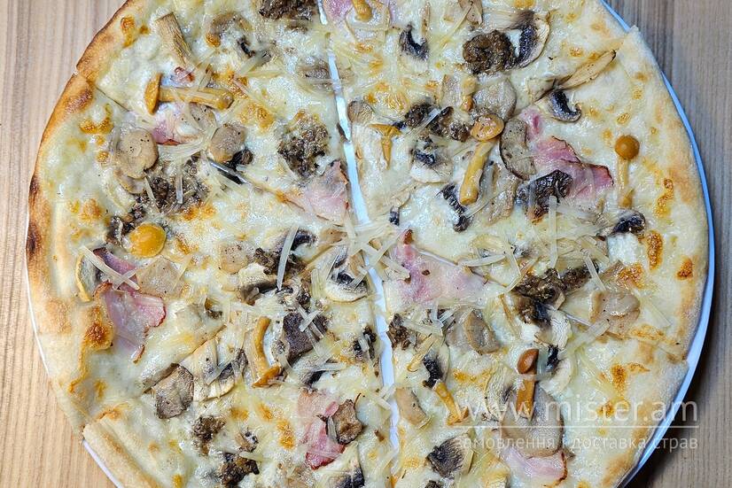 Тонке хрумке тісто, ніжна вершкова основа, сир моцарела, гриби ерінги, печериці, опеньки, бекон, сир пармезан, дюксель грибний і трюфельна олія.