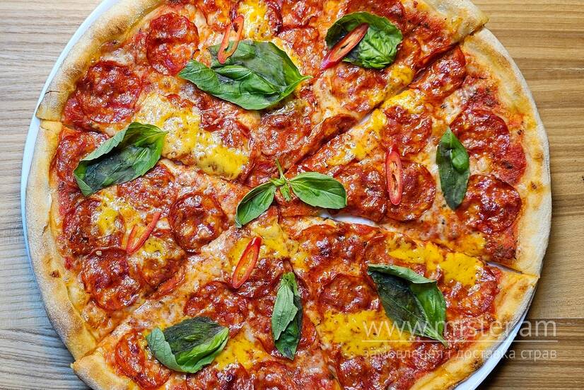 Найсмачніша фірмова піца з пікантною пепероні на томатній основі, з сиром моцарела, з сиром чедер червоний та свіжим базиліком. Композицію смаку довершує свіжий перець чілі та сичуанський перець.