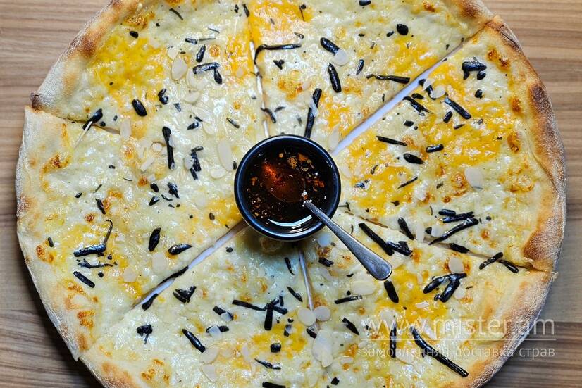 Ще більше сирів в одній піці! Піца готується на білому фірмовому вершковому соусі, в її складі п`ять видив сирів: моцарела, пармезан, радомер, чедер червоний та чорний лимон. Посипається мигдалевими пластівцями. Подається з гострим медом (подається окремо).