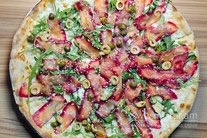 Це яскрава, оригінальна та смачна піца: хрумке тісто, вершкова основа, з додаванням слабо-солоного лосося гравлакс, ніжного сиру моцарела та свіжої руколи, авокадо, оливкок, каперсів та кунжуту, що поєднується в справжній феєрверк смаку.