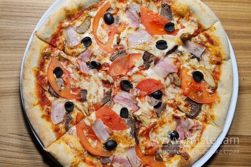 Що може бути смачнішим м'ясної піци? Апетитні шматочки підсмаженої телятини, бекона, курочки, томатів і маслин, покритих тягучим сиром моцарелла. Смакує просто неймовірно!