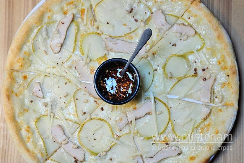 Це вишукане поєднання солодких і солоних ноток на хрусткому тісті, вершкова основа, сир моцарела, сир горгонзола, сир пекоріно, куряче філе су-від, груша, кедровий горіх та рожевий перець. Подаємо з гострим медом.