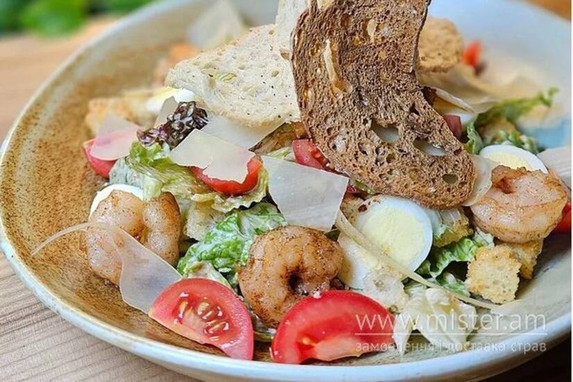 Нове бачення класичного італійського салату — Цезар зі смаженими креветками та пікантною заправкою.