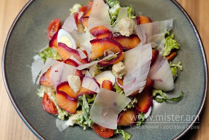 Вишуканий салат з слабосоленим лососем гравлакс, свіжим айсбергом, крутонами, перепелиним яйцем та слайсами пармезану. Заправляється авторським соусом Цезар.