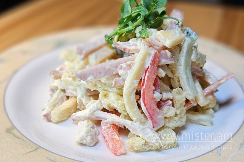 Ситний салат з шинки, відварної курки, овочив, сиру та крутонів.
