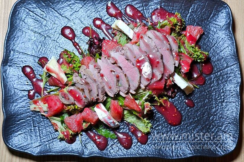 Легкий салат з слайсами качиної грудки су-від, грейпфрутом та сиром з блакитною пліснявою.