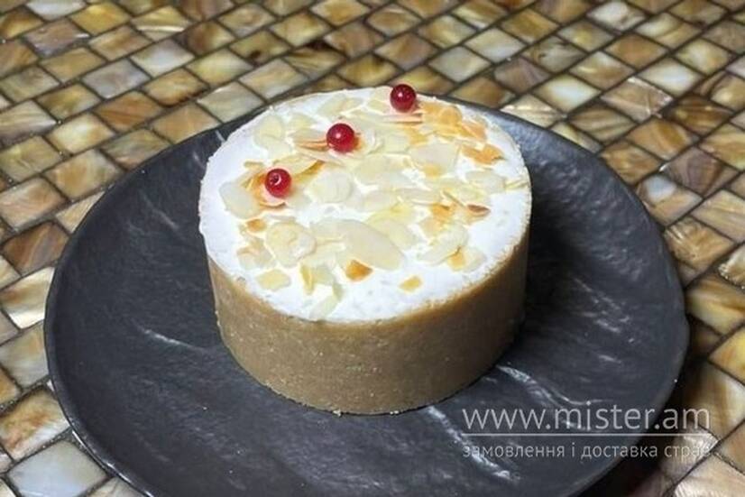 Горіхово-пісочну корзинку заповнюємо ягідним компоте та творожним кремом. Прикрашаємо мигдалевими пластівцями. Десерт не випікаємо.