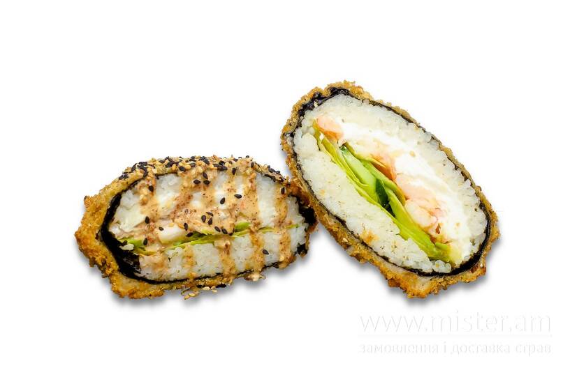 Рис, норі, крем-сир, креветки, огірок, авокадо, айсберг, кляр темпура, сухарі панко, соус горіховий, кунжут.