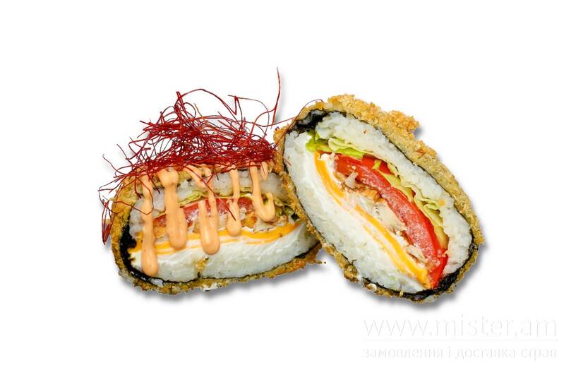 Рис, норі, крем-сир, філе куряче смажене, сир чеддер, помідор, айсберг, кляр темпура, сухарі панко, соус спайсі, нитки чілі.