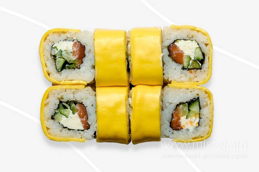 Рис, норі, крем-сир, огірок, лосось, сир тостовий.