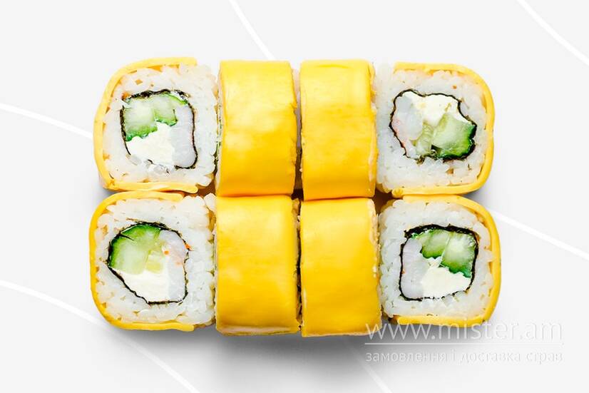 Рис, норі, креветка, огірок, крем-сир, сир тостовий.