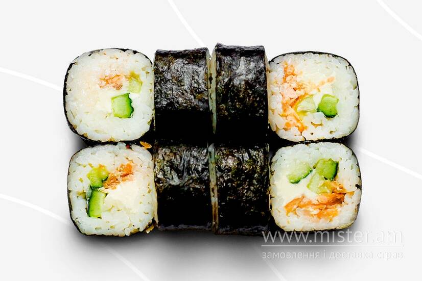 Рис, норі, крем-сир, огірок, смажений лосось.