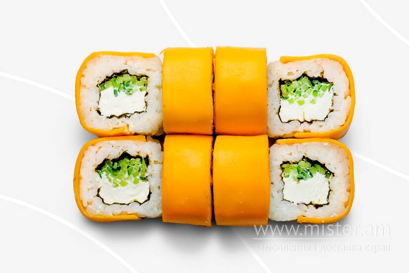Рис, норі, крем-сир, огірок, сир тостовий.