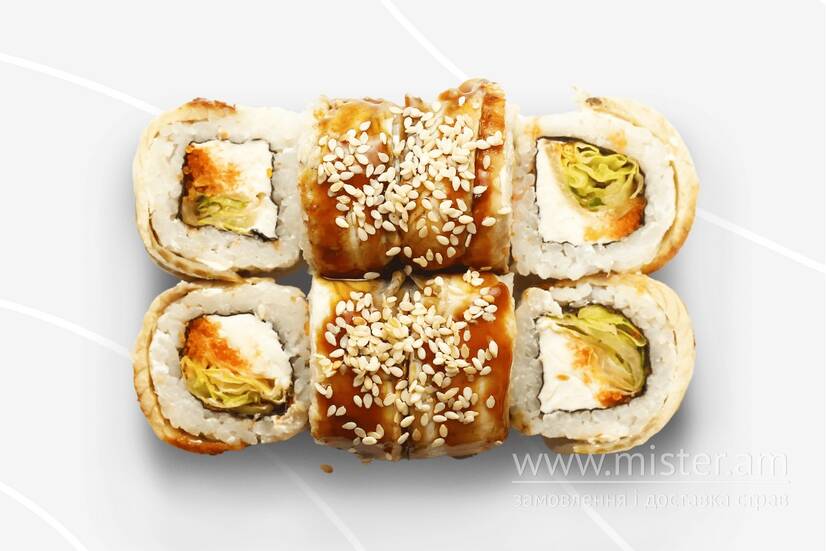 Рис, норі, крем-сир, салат айсберг, вугор, ікра.