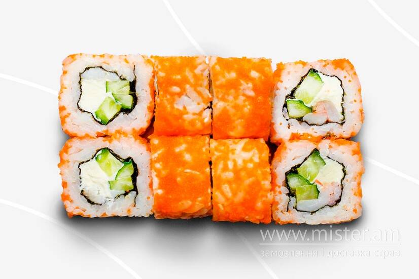 Рис, норі, креветка, огірок, крем-сир, iкра.