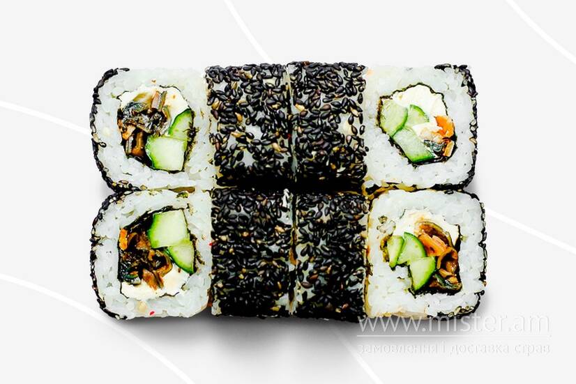 Рис, норі, крем-сир, огірок, вугор, кунжут чорний.