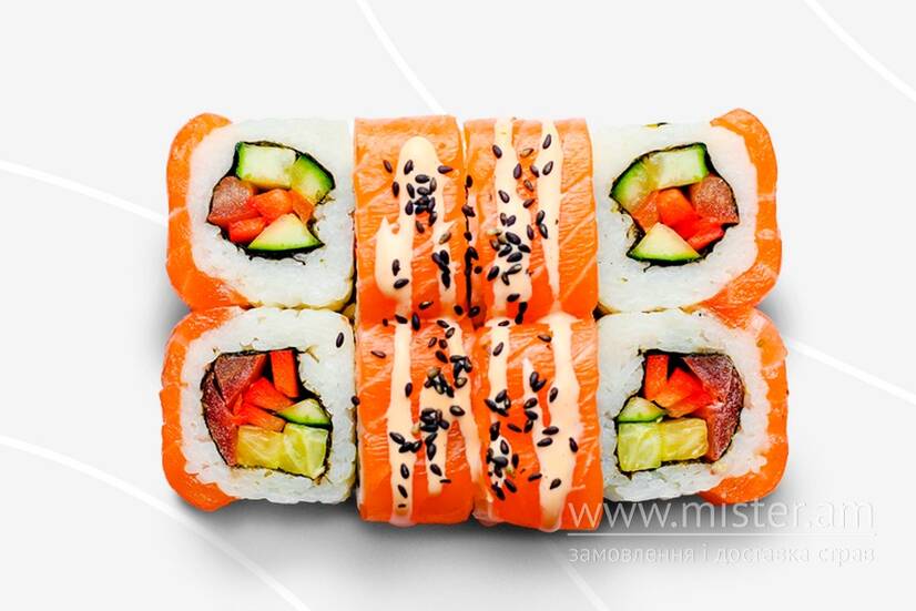 Рис, норі, перець болгарський, огірок, помідор, лосось, кунжут чорний, соус спайсі (гострий).