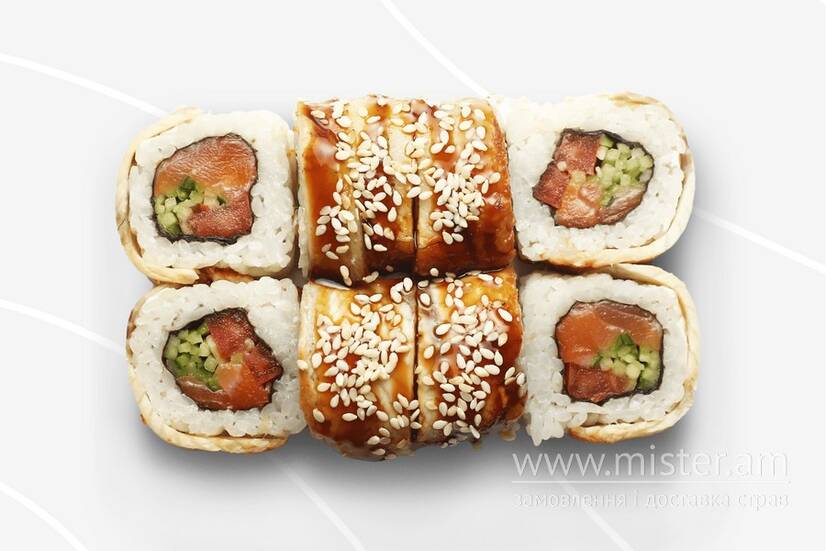 Рис, норі, лосось, вугор, помідор, огірок, соус спайсі (гострий).