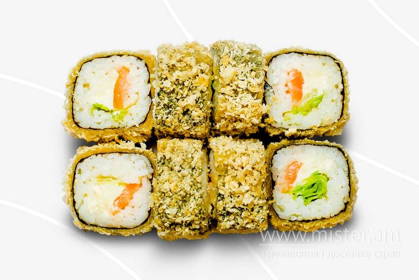 Рис, норі, лосось, айсберг, крем сир, кляр темпура.