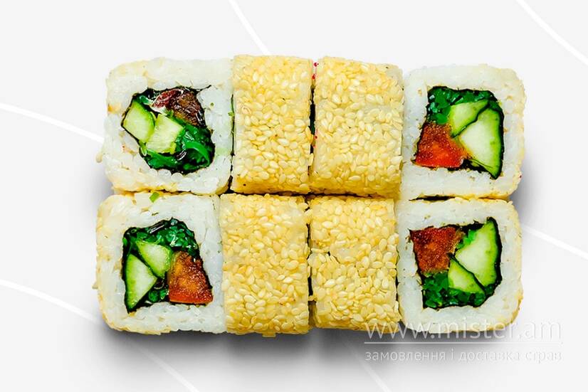 Рис, норі, помідор, огірок, хіяши, кунжут білий.